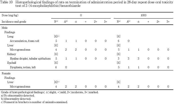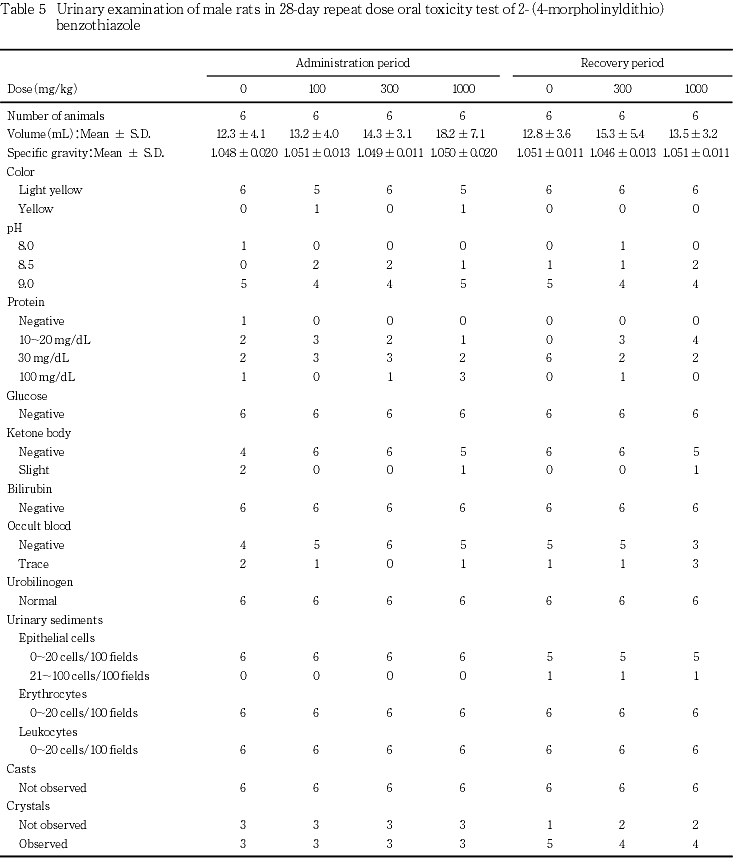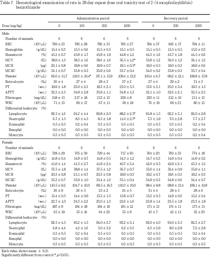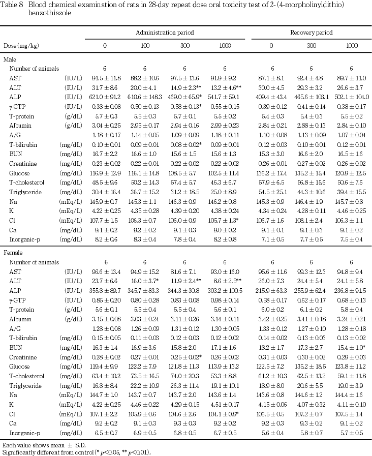 血液生化学検査において,100 mg/kg群の雌,300および1000 mg/kg群の雌雄でALTの低値がみられたが,回復期間終了時には異常は認められなかった.類似化学物質N,N-ジシクロヘキシル-2-ベンゾチアゾールスルフェンアミド2)およびN-シクロヘキシル-2-ベンゾチアゾールスルフェンアミド3)でも,ラットにおいてALTの低値が同様に認められている.また,N-tert-ブチル-2-ベンゾチアゾールスルフェンアミド4)は,ラットではALT活性の測定系に干渉するとの報告がある.そこで,ラット血清に2-(4-モルホリニルジチオ)ベンゾチアゾールを添加し,37 ℃で2時間インキュベーションした結果,同物質を添加しない血清に比べてALT活性は明らかに低値であり,2-(4-モルホリニルジチオ)ベンゾチアゾールはALT測定系に何らかの干渉作用があると考えられる.したがって,当試験におけるALTの低値は,毒性学的意義は小さいと考えられ,特に問題とすべき変化ではないと判断される.