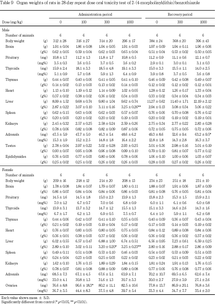 以上のように,2-(4-モルホリニルジチオ)ベンゾチアゾールの無影響量は,雄では1000 mg/kg投与により摂餌量の一過性の低値ならびに肝臓の絶対重量および相対重量の高値傾向あるいは高値が認められたことから300 mg/kg/day,雌では300 mg/kg投与により肝臓の絶対重量および相対重量の高値傾向あるいは高値が認められたことから100 mg/kg/dayと考えられる.