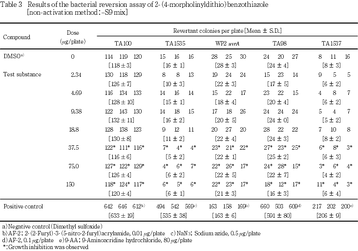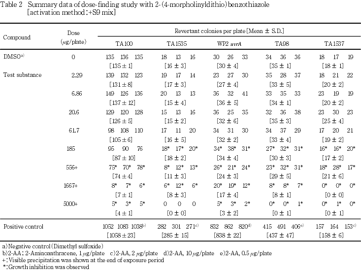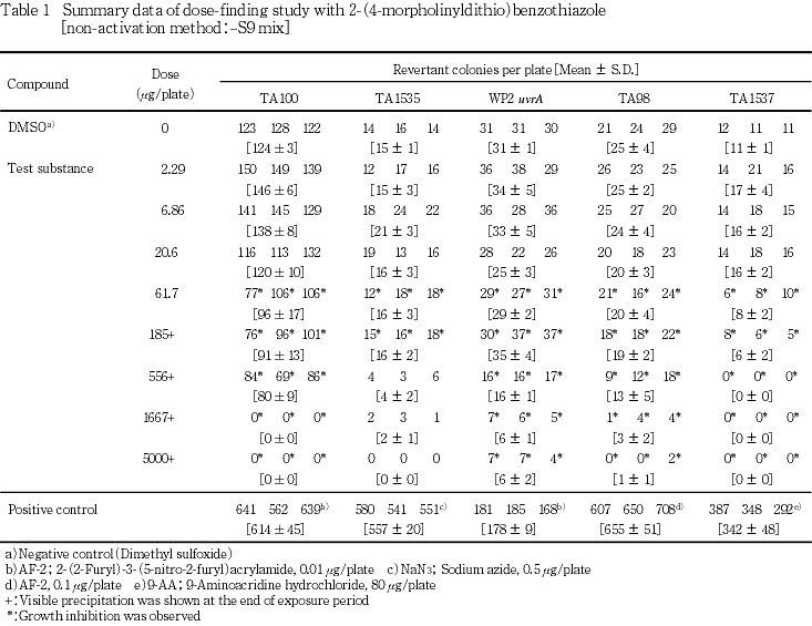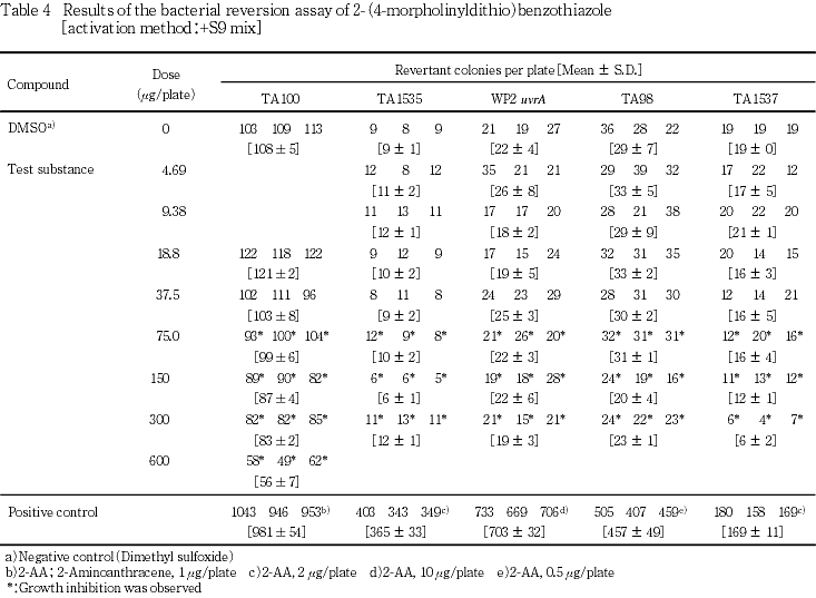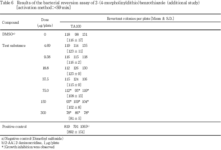 以上の結果より,本試験条件下では2-(4-モルホリニルジチオ)ベンゾチアゾールは,変異原性を有しない(陰性)と結論した.