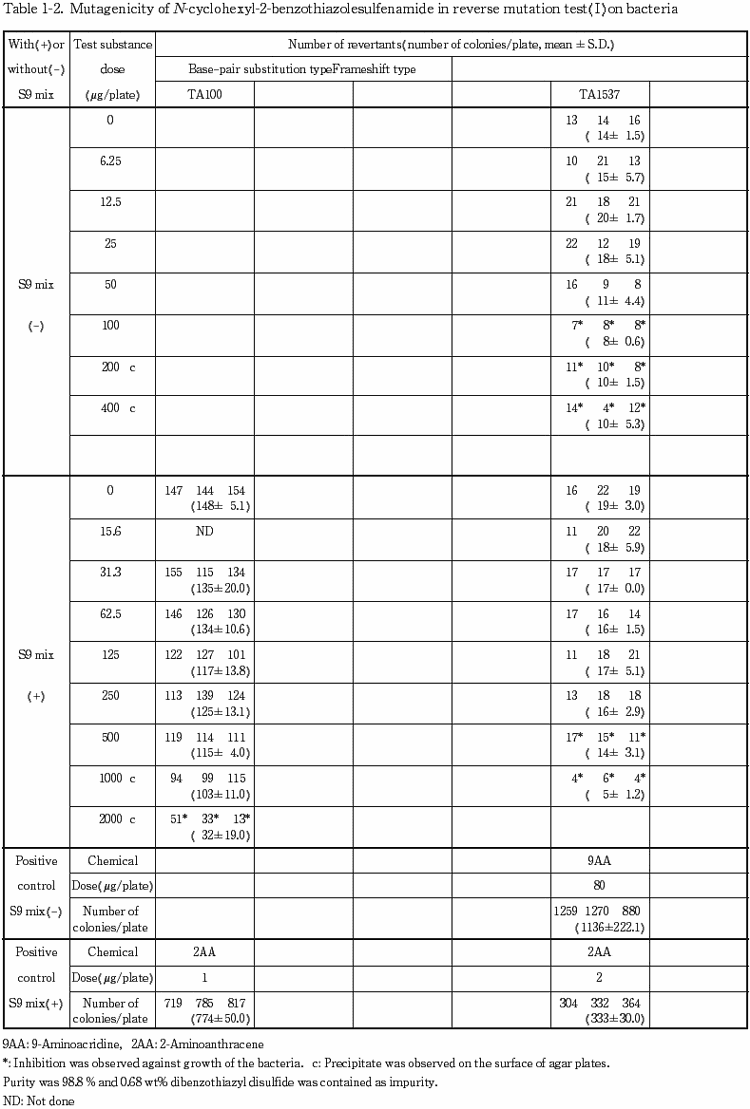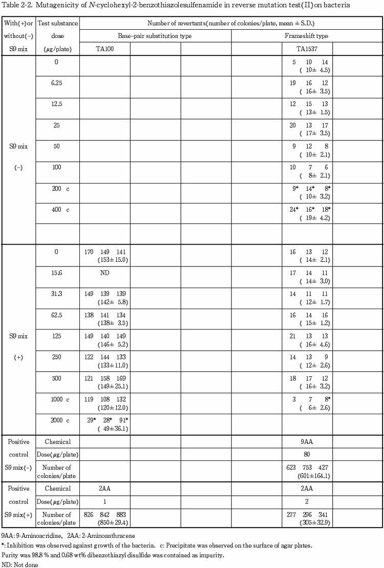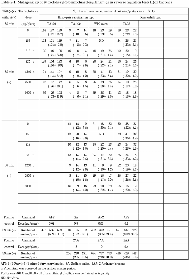 以上の結果から,N-シクロヘキシル-2-ベンゾチアゾールスルフェンアミドは,用いた試験系において変異原性を有しない(陰性)と判定された.