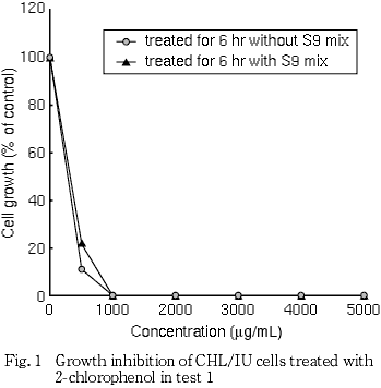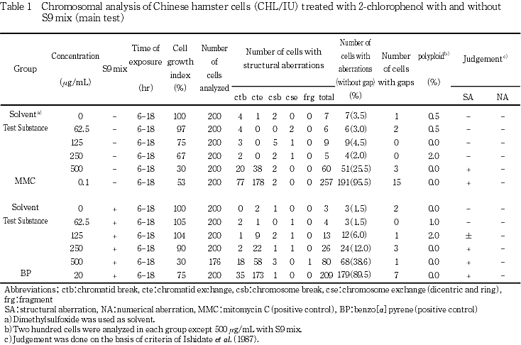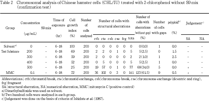 以上の結果より,本試験条件下では2-クロロフェノールは,染色体異常を誘発する(陽性)と結論した.