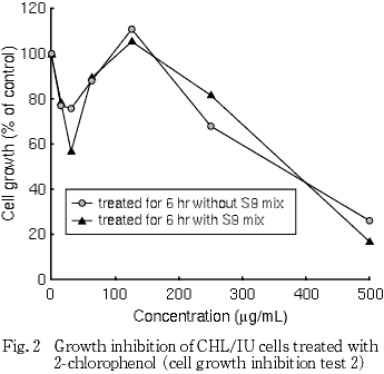 細胞増殖抑制試験2の結果,2-クロロフェノールの約50 %の増殖抑制を示す濃度を,細胞増殖率が50 %を示す濃度を挟む2点を結ぶ直線式より算出したところ,短時間処理法のS9 mix存在下および非存在下ではそれぞれ328,331 μg/mLであった(Fig. 2).