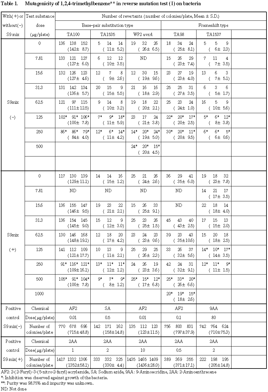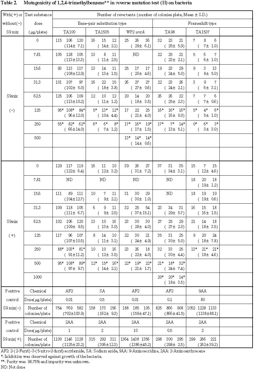 ¤½¤Î·ë²Ì¡¤ S9 mix̵ź²Ã»î¸³¤Ç¤Ï¡¤TA100, TA1535, TA98¤ª¤è¤ÓTA1537¤Ç¤Ï125 ¦Ìg/¥×¥ì¡¼¥È°Ê¾å¡¤WP2 uvrA¤Ç¤Ï¡¤250 ¦Ìg/¥×¥ì¡¼¥È°Ê¾å¡¤S9 mixź²Ã»î¸³¤Ç¤Ï¡¤TA1537¤Ç¤Ï125 ¦Ìg/¥×¥ì¡¼¥È°Ê¾å¡¤TA100¤ª¤è¤Ó TA1535¤Ç¤Ï250 ¦Ìg/¥×¥ì¡¼¥È°Ê¾å¡¤TA98¤ª¤è¤ÓWP2 uvrA¤Ç¤Ï¡¤500 ¦Ìg/¥×¥ì¡¼¥È°Ê¾å¤ÎÍÑÎ̤ǹ³¶ÝÀ¤¬Ç§¤á¤é¤ì¤¿¡¥Éüµ¢ÊѰۥ³¥í¥Ë¡¼¿ô¤Ï¡¤2²ó¤ÎËܻ¤È¤â¡¤ÍѤ¤¤¿¸¡Äê¶Ý¤Ë¤Ä¤¤¤Æ¡¤¤¤¤º¤ì¤ÎÍÑÎ̤ˤª¤¤¤Æ¤âÁý²Ã¤Ïǧ¤á¤é¤ì¤Ê¤«¤Ã¤¿¤³¤È¤«¤é¡¤1,2,4-¥È¥ê¥á¥Á¥ë¥Ù¥ó¥¼¥ó¤Ï¡¤ÍѤ¤¤¿»î¸³·Ï¤Ë¤ª¤¤¤ÆÊѰ۸¶À¤òͤ·¤Ê¤¤(±¢À)¤ÈȽÄꤵ¤ì¤¿¡¥