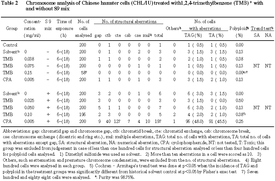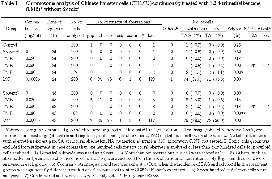 1,2,4-トリメチルベンゼンは,上記の試験条件下で,試験管内のCHL/IU細胞に染色体異常を誘発しないと結論した.