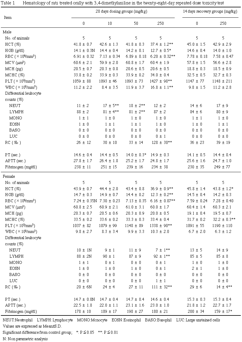 血液学検査の結果,雌雄の250 mg/kg群でヘマトクリット値,ヘモグロビン量および赤血球数の低値,血小板数および網赤血球率の高値が認められ,さらに雄の同群で白血球数の高値が認められた.本被験物質は芳香族アミン化合物でありメトヘモグロビン血症を誘発させる可能性があり,上述の諸変化もメトヘモグロビン血症によるものと推察されるが,白血球数高値の起因は明確でない.