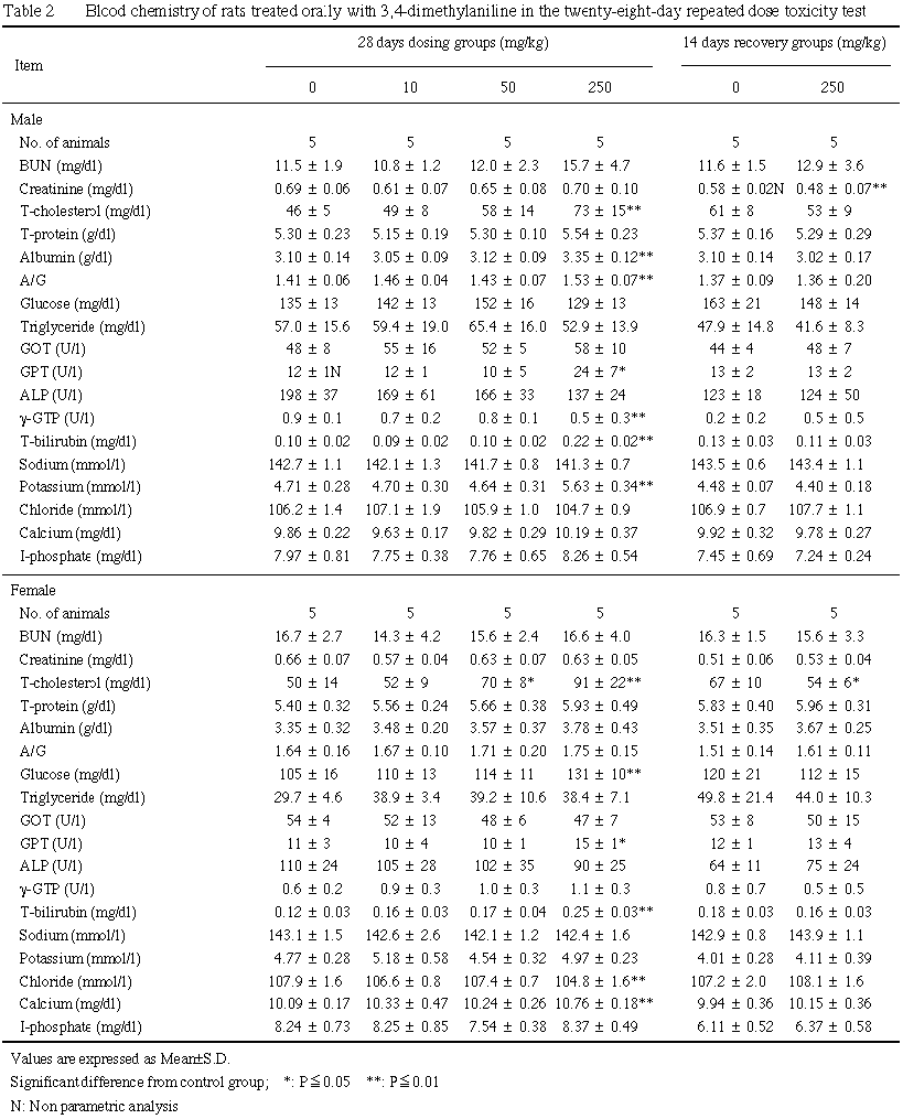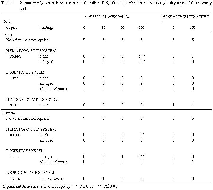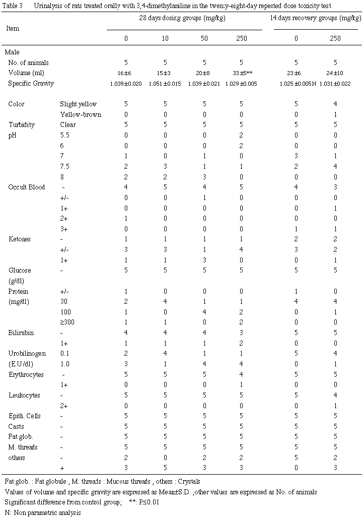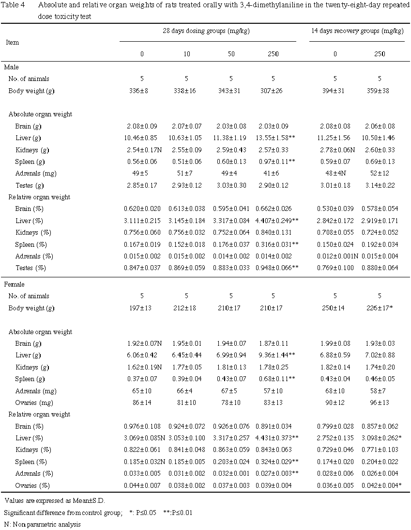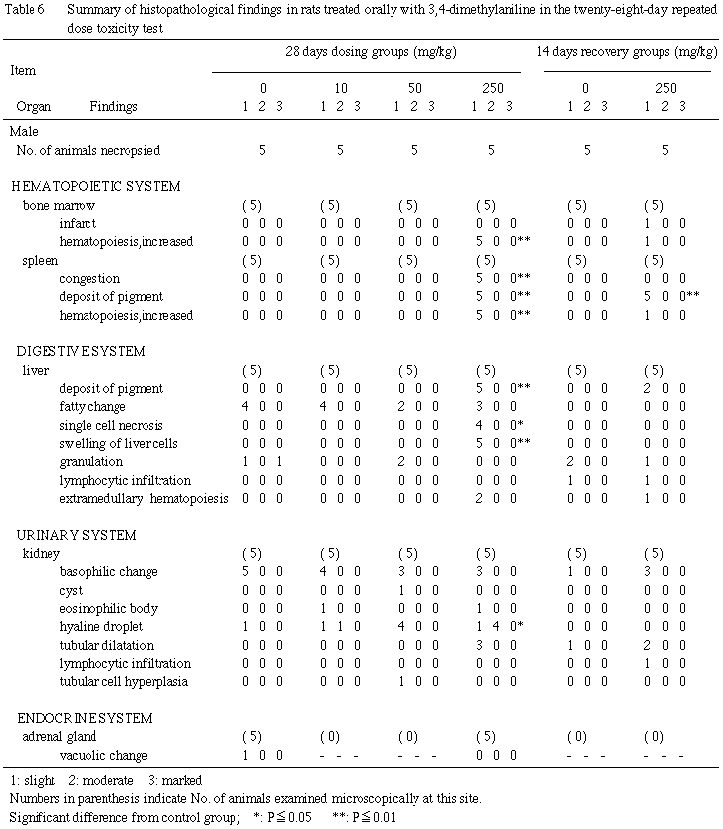 3,4-ジメチルアニリンは,コーン油に溶解し,0,10,50および250 mg/kgを毎日1回,4週間連続経口投与し,一般状態の観察,体重測定,摂餌量測定,血液学検査,血液凝固能検査,血液生化学検査,尿検査,器官重量測定および病理学的検査を行った.なお,回復期間は2週間とし,投与終了時と同様な検査を実施した.
