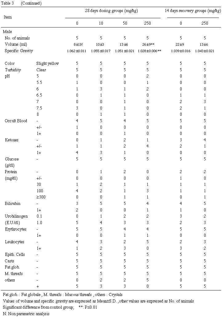 尿検査の結果,雌雄の250 mg/kg群で尿量の増加,尿の酸性化および沈渣赤血球陽性動物の出現が認められ,雌の同群では尿比重も低値を示した.回復期間終了時の検査では,これらの変化はすべて回復した.