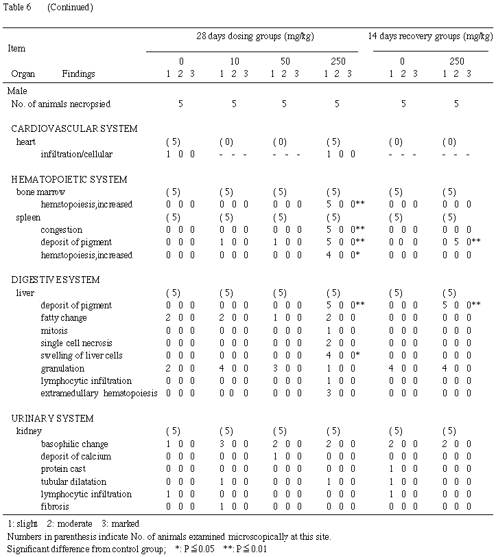 投与終了時において,対照群に比較して被験物質投与群に多い所見として,骨髄の造血亢進,脾臓の充血,色素沈着および肝臓のクッパー細胞の色素沈着が雌雄の250 mg/kg群の全例に,脾臓の造血亢進および肝細胞腫脹が250 mg/kg群の雄の全例および雌の4例に,腎臓の硝子滴変性が雄の対照群,10,50および250 mg/kg群の順にそれぞれ1,2,4および5例に観察された.また,肝臓の単細胞壊死が250 mg/kg群の雄の4例および雌の2例に,髄外造血が250 mg/kg群の雄で2例,雌で3例に観察された.