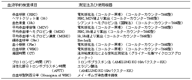 投与46日の翌日に全例について、約16時間絶食した後、エーテル麻酔下で大腿静脈より採血し、EDTA・2Kで処理した血液を用いて、以下に示す検査を行った。さらに、CT は無処理血液を用いて、PT, APTT については腹部大動脈より採血し、クエン酸ナトリウムで処理した後、3000r.p.m.で10分間遠心分離して得られた血漿を用いて検査を行った。
