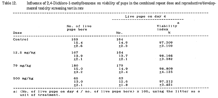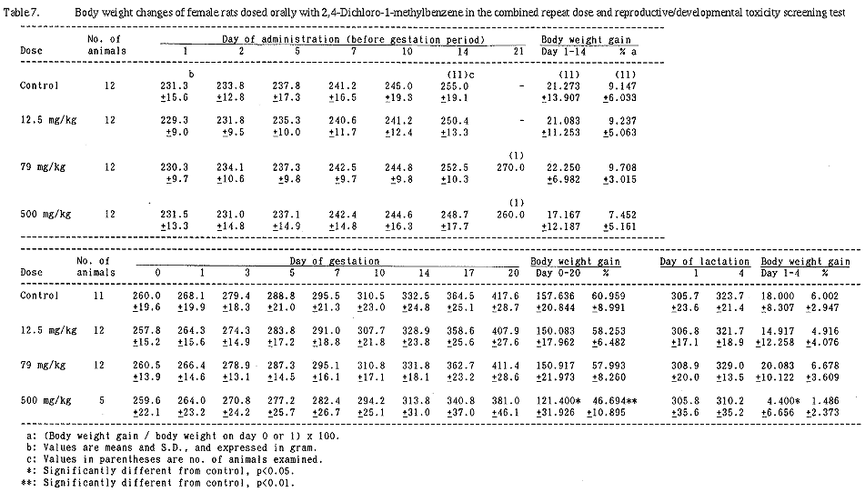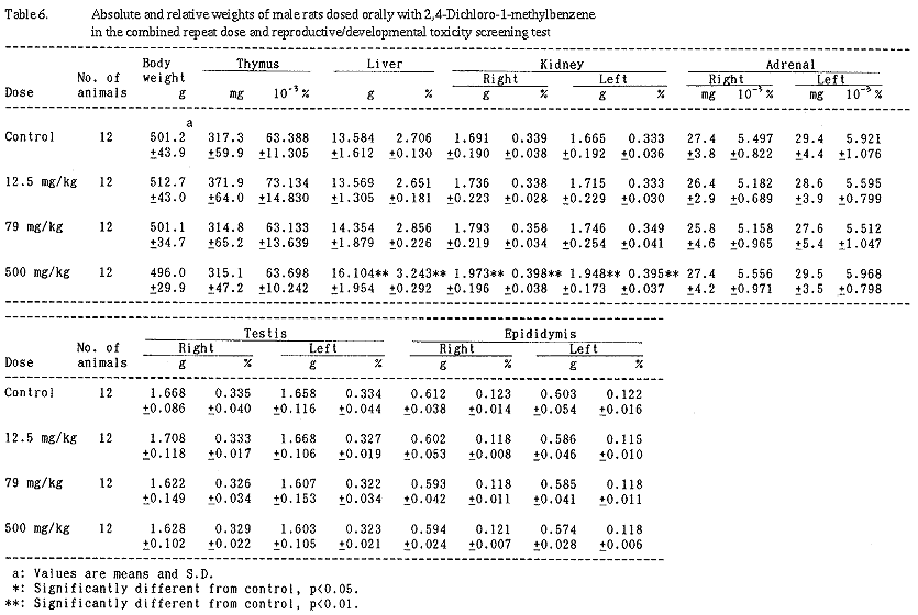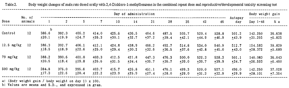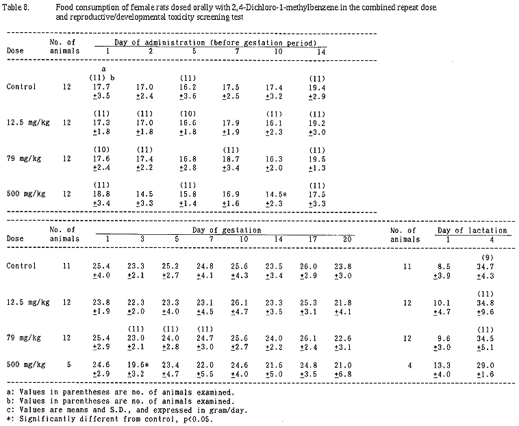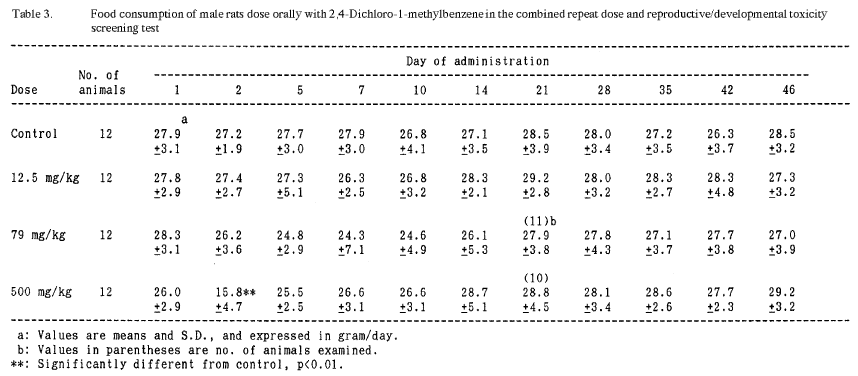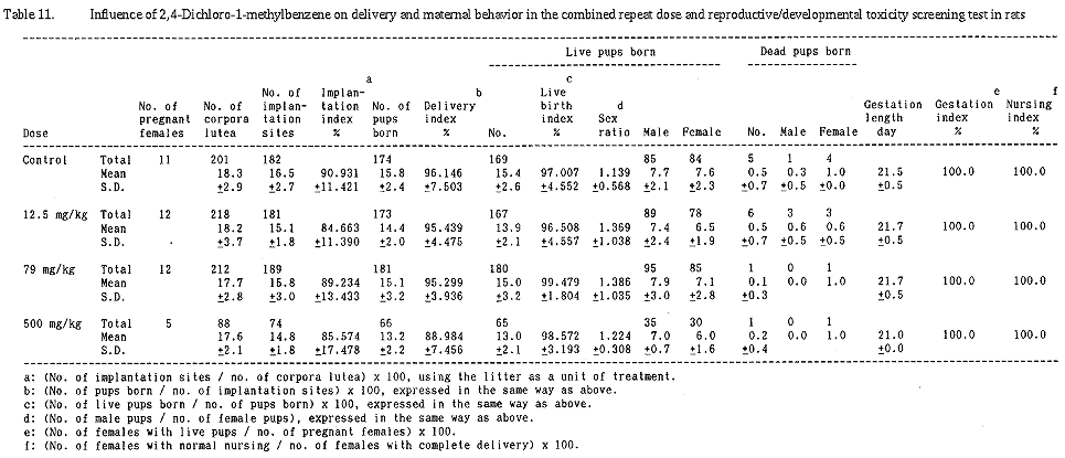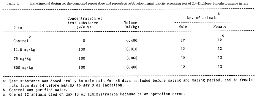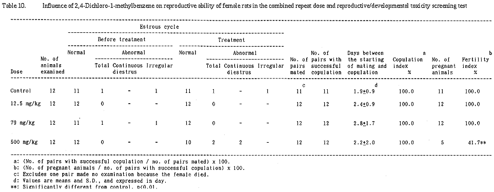 以上より、被験物質の生殖・発生に対する主な影響として、500 mg/kg群で受胎率の低下が認められた。また、その原因として雄の生殖器及び副生殖器の機能的障害を示唆する所見、すなわち、不妊の多数例で交尾成立時に腟栓がみられないかあるいは腟垢中の精子数が少ないことが確認された。これらのことから、本スクリーニング試験における2, 4−ジクロロ−1−メチルベンゼンの雌雄動物の生殖・発生に対する無影響量 (NOEL)は雌雄ともに79 mg/kg/dayであることが示唆された。