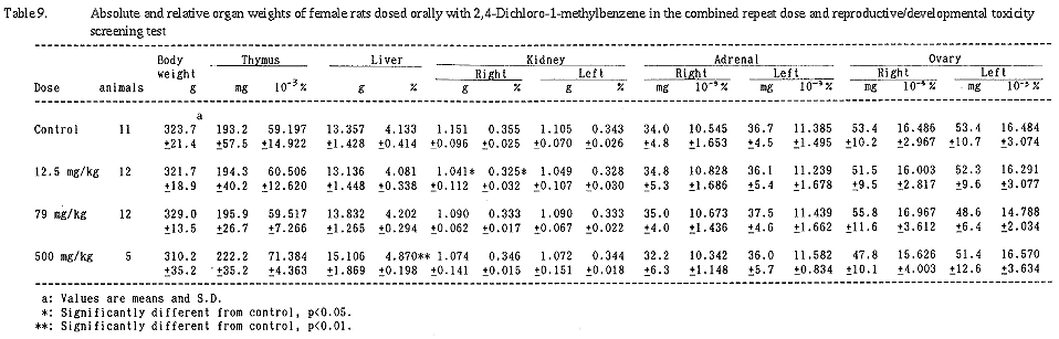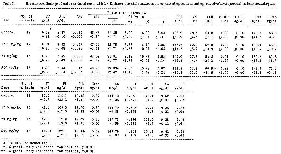 | (4) | 以上より、生殖・発生に対する主な影響として、500 mg/kg群で受胎率の低下が認められた。また、その原因として雄の生殖器及び副生殖器の機能的障害を示唆する所見、すなわち、不妊の多数例で交尾成立時に腟栓がみられないあるいは腟垢中の精子数が少ないことが確認された。これらのことから、本スクリーニング試験における2, 4−ジクロロ−1−メチルベンゼンの雌雄動物の生殖・発生に対する無影響 (NOEL) 量は雌雄ともに79 mg/kg/dayであることが示唆された。 |