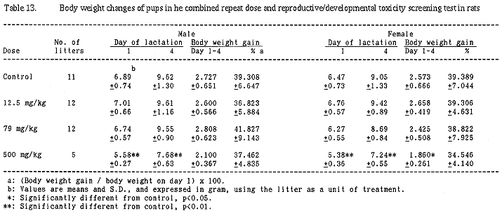 | (2) | 新生児の体重推移では、500 mg/kg群の雌雄で哺育1及び4日に体重の低値が認められた。 |