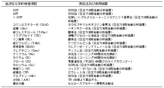 投与46日の翌日に全例について、血液学的検査のための採血後、腹部大動脈より採血し3000r.p.m.で10分間遠心分離して、得られた血清を用いて次の検査を行った。