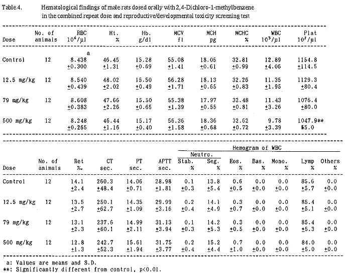 血液学的検査では、500 mg/kg群の雄で血小板数の減少が認められた。トルエンを含む接着剤やシンナーの長期間吸入によって骨髄機能の減退や形成不全性貧血が認められることが報告されており1)、2, 4−ジクロロ−1−メチルベンゼンにおいても同様な原因による可能性が懸念されたが、本試験では病理組織学的検査の結果、胸骨及び大腿骨の骨髄に異常は認められなかった。