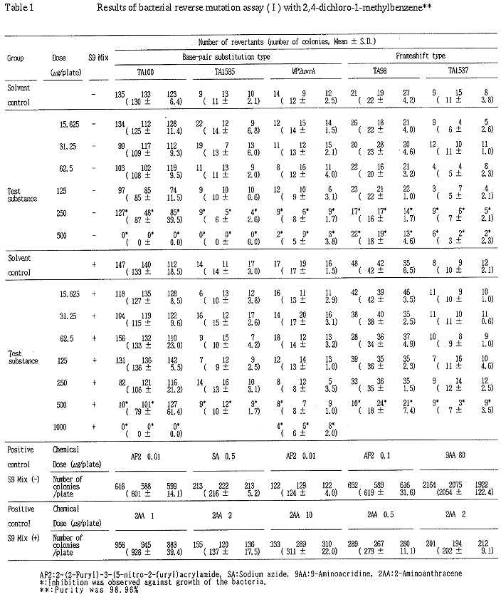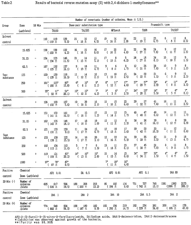 その結果、2回の本試験とも、用いた5種類の検定菌において、いずれの用量でも復帰変異コロニー数の増加が認められなかったことから、2, 4−ジクロロ−1−メチルベンゼンは、用いた試験系において変異原性を有しない(陰性)と判定された。