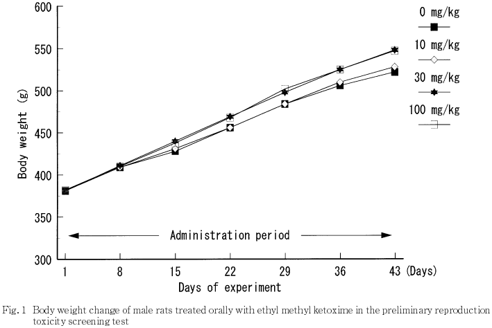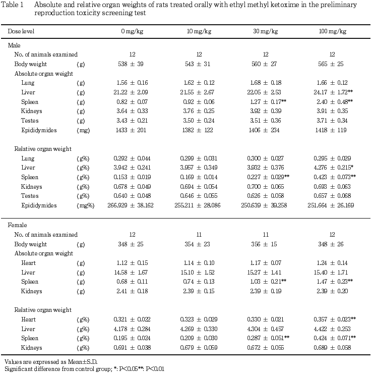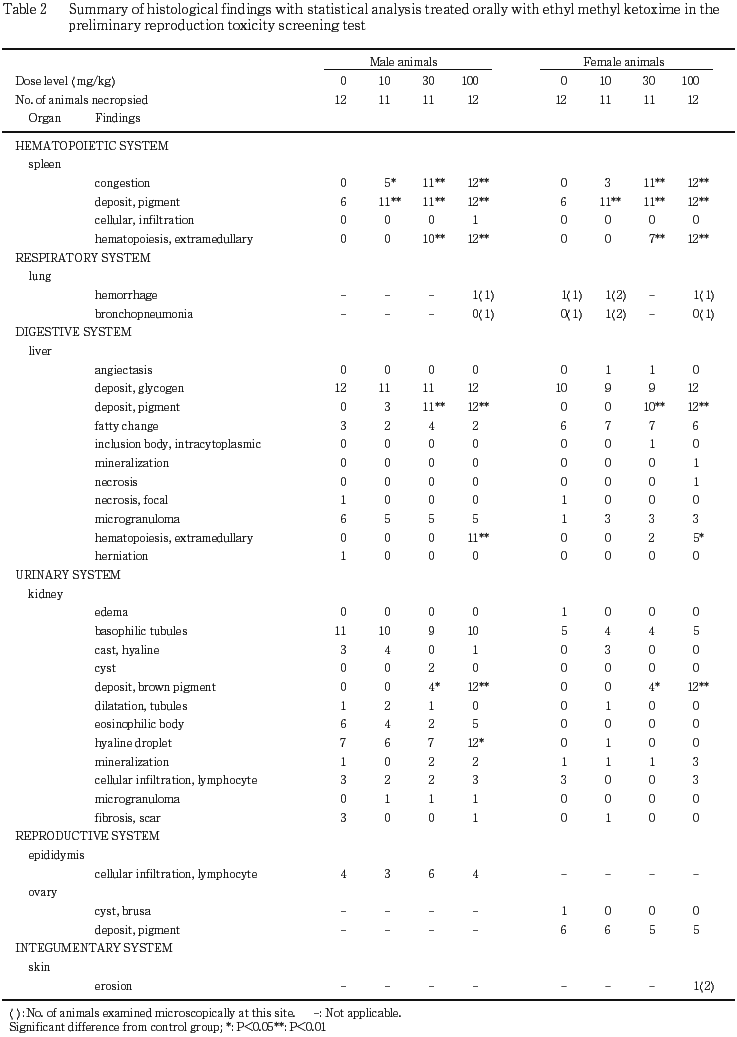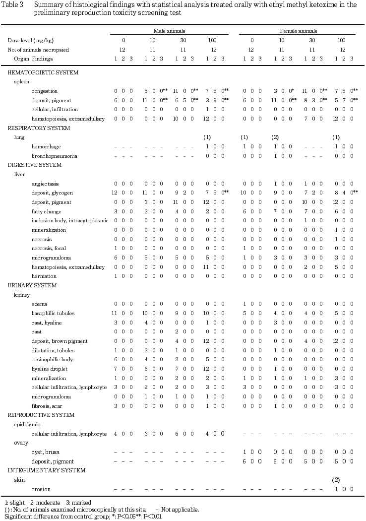 以上のことから,本試験条件下におけるエチルメチルケトキシムの親動物に対する無影響量は雌雄の10 mg/kg以上の投与群に脾臓のうっ血および色素沈着等の組織所見が認められたことから,雌雄とも10 mg/kg/day未満と判断された.