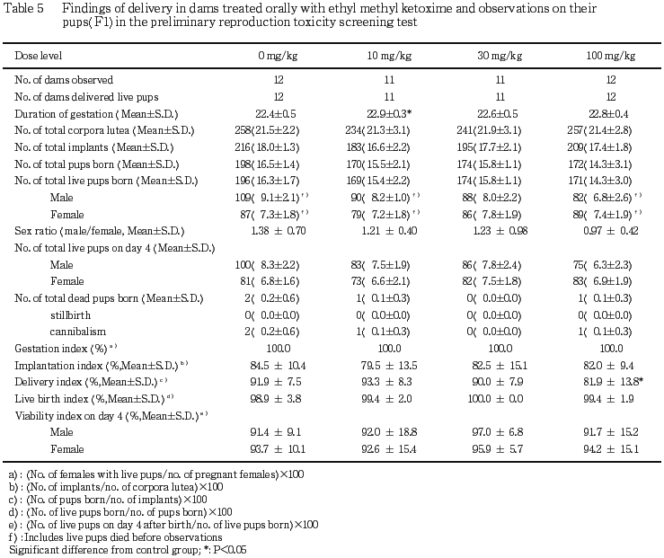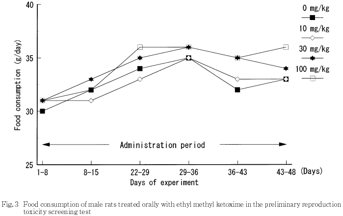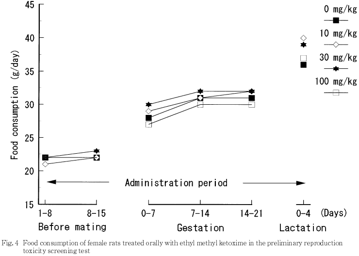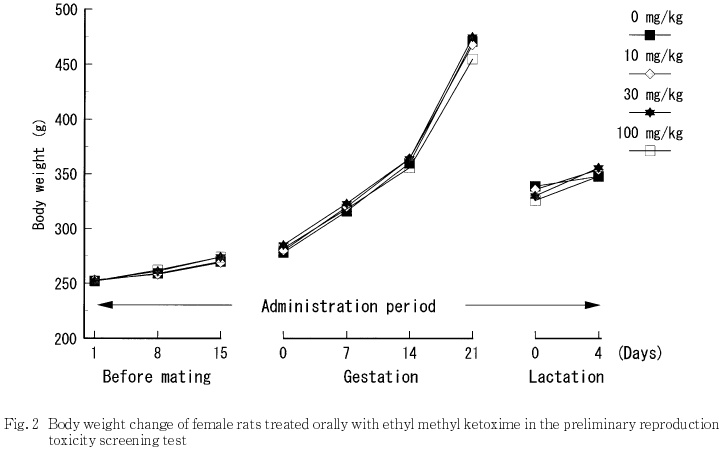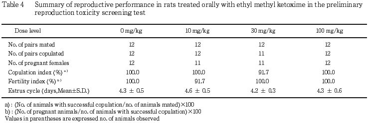 以上のことから,エチルメチルケトキシムの雄の生殖に及ぼす影響は,100 mg/kg/day投与でも認められず,無影響量は100 mg/kg/dayと判断された.雌の生殖に及ぼす影響は100 mg/kg/day投与で分娩率が低値を示したことから,無影響量は30 mg/kg/dayと判断された.児動物の発生・発育に及ぼす影響は 100 mg/kg/day投与によっても認められず,無影響量は 100 mg/kg/dayと判断された.