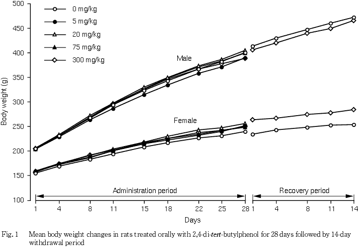 投与期間を通して,2,4-ジ-tert-ブチルフェノール各群は対照群とほぼ同様な推移を示した.なお,個体別にみると300 mg/kg群の雄1例で投与18および22日に増加抑制,ならびに投与25および28日に減少が認められ,また,雌1例で投与25日に明らかな減少が認められたが,後述の通り病理組織学的検査の結果から誤投与によるものと推測された.