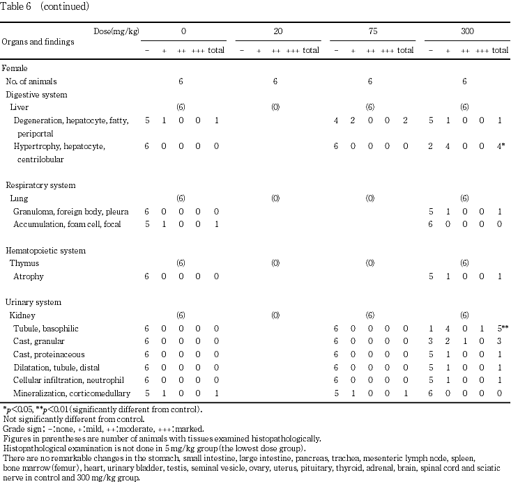 病理組織学検査では,300 mg/kg群の雌雄で小葉中心性の肝細胞の肥大,ならびに腎臓の好塩基性尿細管,顆粒円柱および蛋白円柱が認められた.さらに,腎臓で肉眼的変化のみられた例に好中球性細胞浸潤,遠位尿細管の拡張あるいは近位尿細管の肥大が認められた.