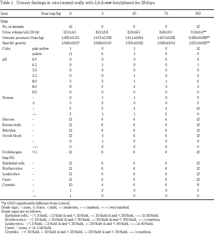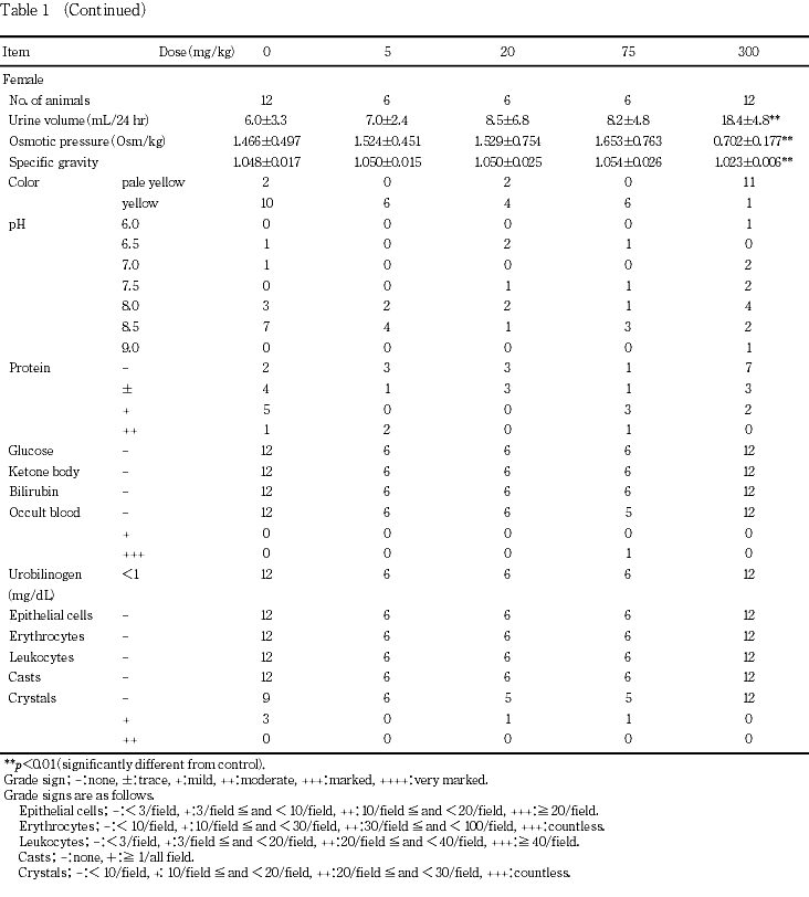 尿検査では,300 mg/kg群の雌雄で尿量の増加,尿浸透圧および比重の低下,ならびに尿色調の淡黄色化が認められた.