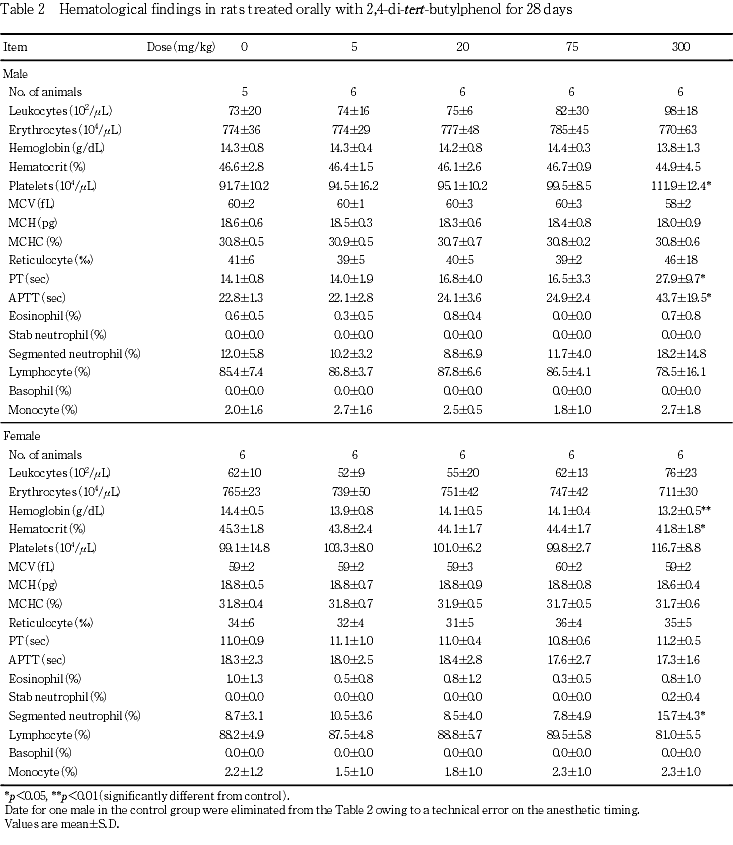 回復期間終了時の検査では,300 mg/kg群の雄でMCHの減少が認められ,雌でMCHCの減少およびAPTTの短縮が認められたが,いずれも軽度な変化であり,かつ同様の変化は投与期間終了時の検査時には認められていないことから,2,4-ジ-tert-ブチルフェノール投与との関連性はないと考えられた.