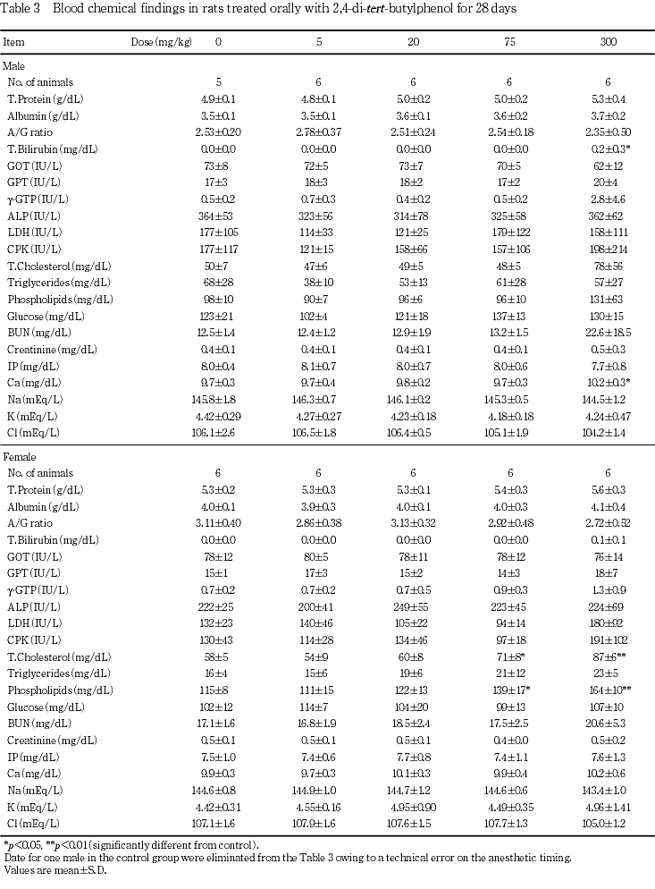 回復期間終了時の検査では,300 mg/kg群の雌で総コレステロールおよびリン脂質の増加が認められた.その他,300 mg/kg群の雄でA/G比の増加が認められ,雌でGPTの減少,ならびにトリグリセライドおよびグルコースの増加が認められたが,いずれも軽度な変化であり,同様の変化は投与期間終了時の検査時には認められていないことから,2,4-ジ-tert-ブチルフェノールとの関連性はないと考えられた.