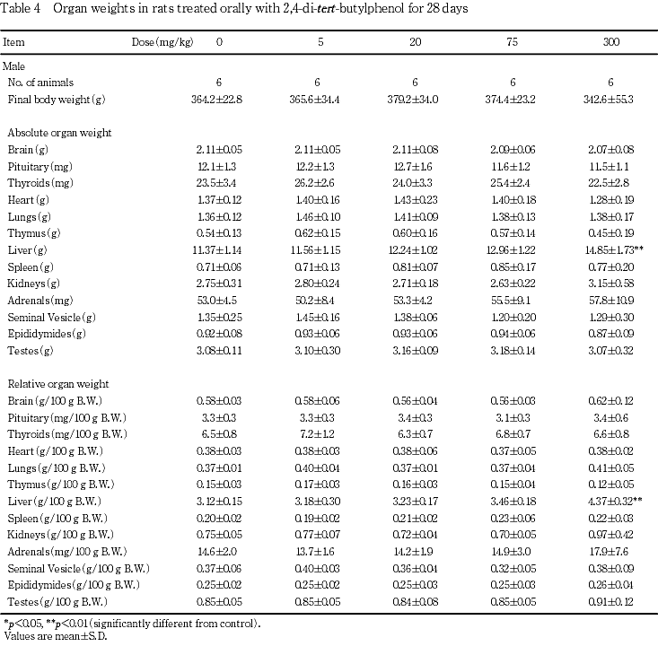 回復期間終了時の検査では,300 mg/kg群の雌で肝臓の絶対および相対重量の増加,雄で肝臓の相対重量の増加が認められたが,変化の程度は投与期間終了時のものと比較して軽減していた.さらに,300 mg/kg群の雌で腎臓の絶対重量の増加が認められた.その他,300 mg/kg群の雄で精巣上体の絶対重量の減少,および雌で脾臓の絶対重量の増加が認められたが,同様の変化は投与期間終了時の検査には認められておらず,かつ後述する投与期間終了時の当該器官における病理組織学検査では被験物質投与に関連する変化は認められていないことから,2,4-ジ-tert-ブチルフェノール投与との関連性はないと考えられた.