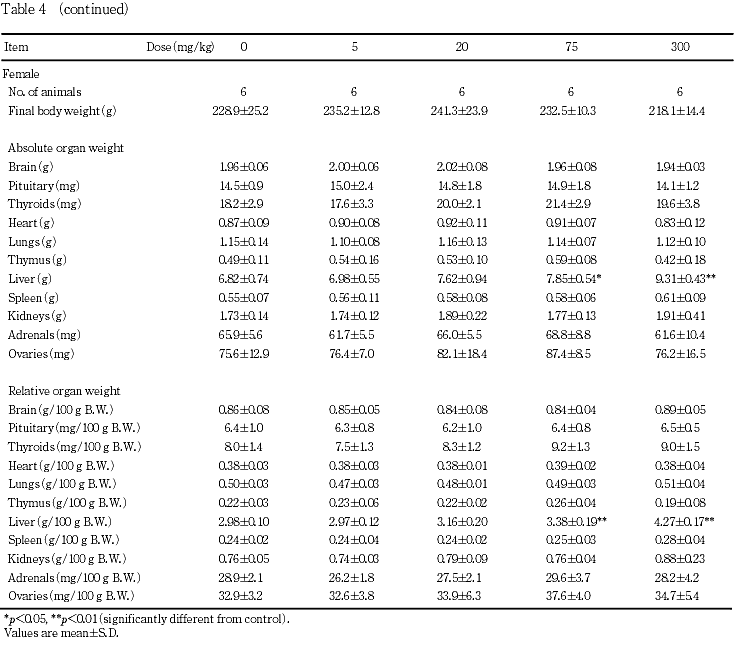 投与期間終了時の検査では,75 mg/kg群の雌および300 mg/kg群の雌雄で肝臓の絶対および相対重量の増加が認められた.なお,個体別にみると300 mg/kg群の雄1例で肝臓重量の増加に加え,腎臓および副腎の絶対および相対重量の増加,胸腺の絶対および相対重量の減少,ならびに脾臓の絶対重量の減少が認められ,300 mg/kg群の雌1例で肝臓重量の増加に加え,腎臓の絶対および相対重量の増加,ならびに胸腺の絶対および相対重量の減少が認められた.