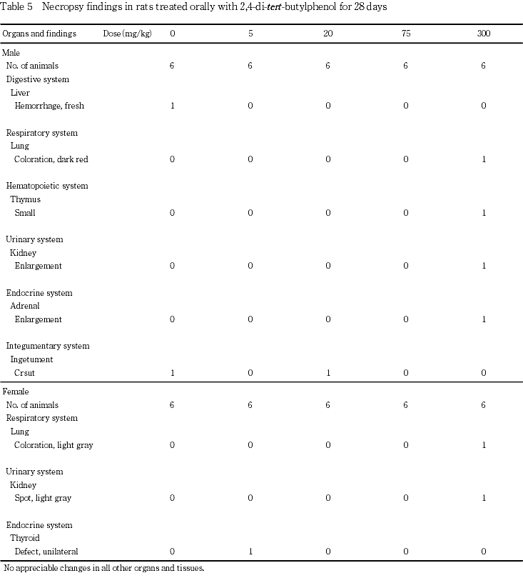 回復期間終了時の検査では,2,4-ジ-tert-ブチルフェノール投与に関連すると考えられる変化は認められなかった.偶発的な変化として,300 mg/kg群の雌1例で下腹部皮下の腫瘤が認められた.