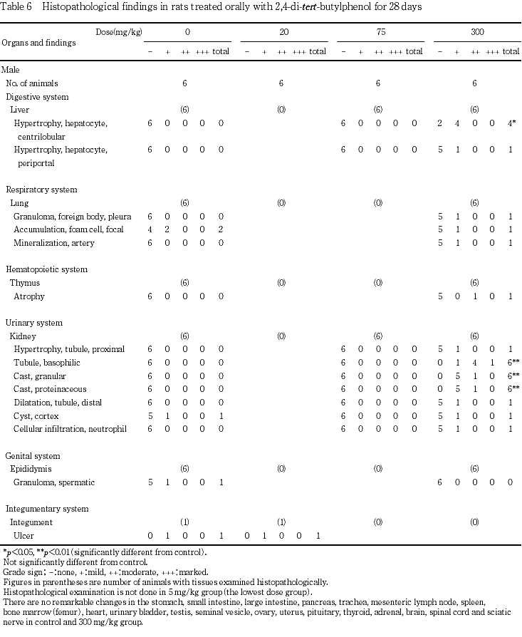 投与期間終了時の検査において,肝臓では,300 mg/kg群の雌雄各4例で小葉中心性の肝細胞肥大が認められ,同群の別の雄1例で門脈周囲性の肝細胞肥大が認められた.腎臓では,300 mg/kg群の雄全例および雌5例で好塩基性尿細管が認められ,これらのうち雄全例および雌3例で顆粒円柱,雄全例および雌1例で蛋白円柱が認められた.さらに,300 mg/kg群の雌雄各1例のうち,好塩基性尿細管の程度が強かった雄1例で近位尿細管の肥大,遠位尿細管の拡張および好中球性細胞浸潤がみられ,雌1例で遠位尿細管の拡張および好中球性細胞浸潤が認められた.75 mg/kg群の雌雄では,肝臓および腎臓において被験物質投与に関連した変化は認められなかった.その他,対照群および2,4-ジ-tert-ブチルフェノール各群で肝臓の門脈周囲性の脂肪変性,肺の肺胞内泡沫細胞または動脈壁への鉱質沈着,腎臓皮質の嚢胞または皮髄境界部の鉱質沈着,精巣上体の精子肉芽腫,頸部皮膚の潰瘍が散見されたが,それらの出現頻度および程度に対照群との差はなく,いずれも被験物質投与と関連のない自然発生あるいは偶発的な変化と考えられた.また,300mg/kg群の雌雄各1例で肉眼的に肺の変化がみられた部位で異物肉芽腫がみられ,加えて胸腺の萎縮が認められたが,いずれも誤投与による変化ならびに誤投与にともなう全身状態の悪化に起因した変化と判断した.