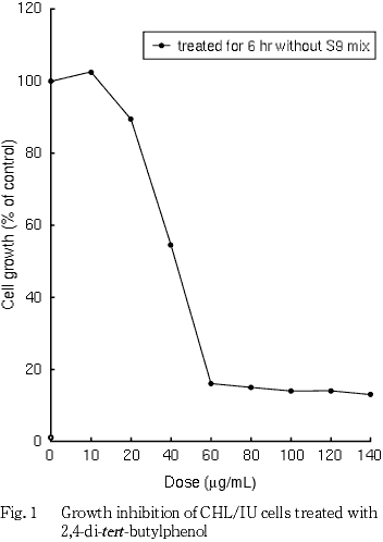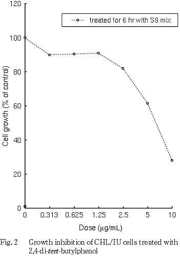 2,4-ジ-tert-ブチルフェノールの染色体異常誘発性の有無を検討するため,チャイニーズ・ハムスター肺由来の線維芽細胞株(CHL/IU)を用いてin vitroにおける短時間処理法による染色体異常試験を実施した.