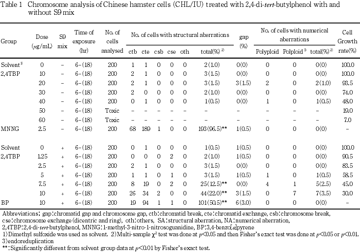 以上の成績から,2,4-ジ-tert-ブチルフェノールは,CHL/IU細胞に対し染色体異常を誘発する(陽性)と結論した.