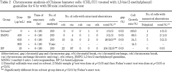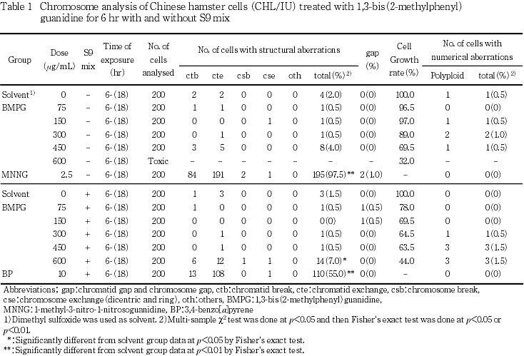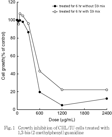 以上の成績から,1,3-ビス(2-メチルフェニル)グアニジンのCHL/IU細胞に対する染色体異常誘発性は陽性と判定した.