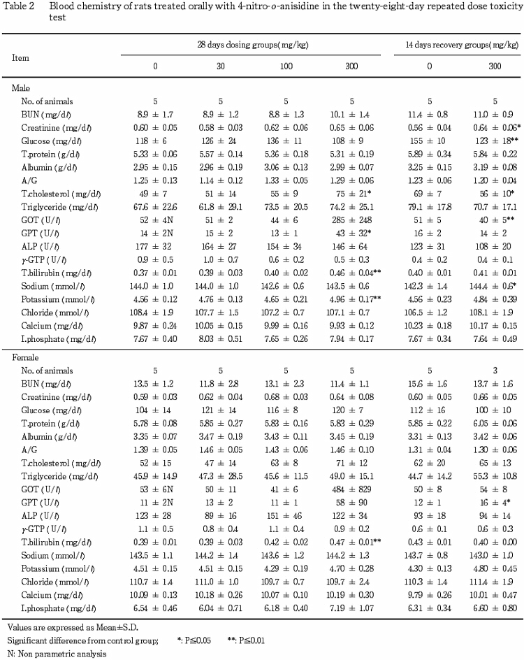 ·ì±ÕÀ¸²½³Ø¸¡ºº¤Î·ë²Ì¡¤»óͺ¤Î300 mg/kg·²¤ÇÁí¥³¥ì¥¹¥Æ¥í¡¼¥ë¡¤GOT¡¤GPT¤ª¤è¤ÓÁí¥Ó¥ê¥ë¥Ó¥ó¤¬¹âÃͤò¼¨¤·¡¤¤µ¤é¤Ë¡¤Íº¤ÎƱ·²¤Ç¤Ï¥«¥ê¥¦¥à¤¬¹âÃͤò¼¨¤·¤¿¡¥