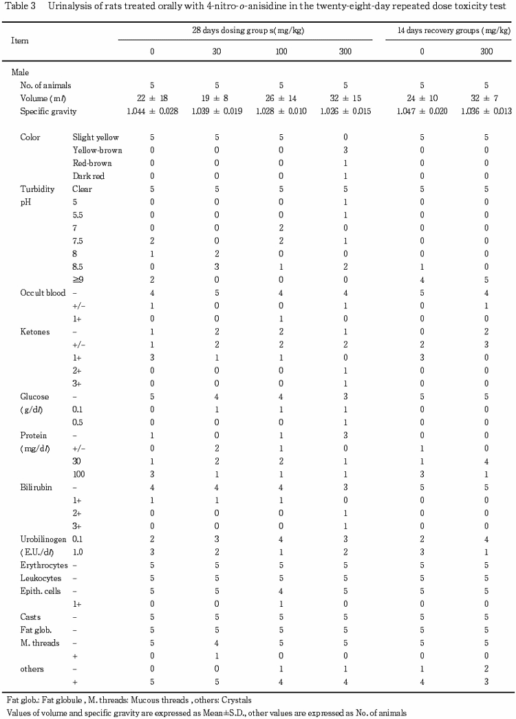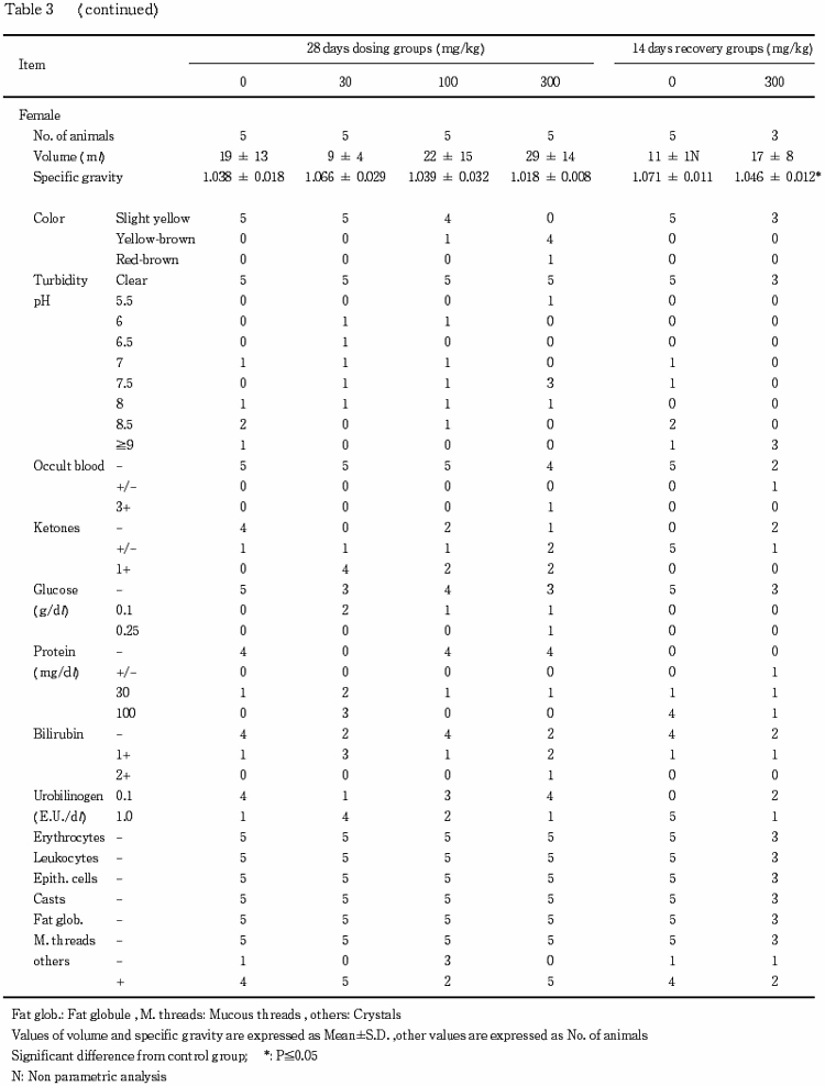 »ó¤Ç¤Ï¡¤È︳ʪ¼ÁÅêÍ¿·²¤ÎÁ´Îã¤Ç²«¿§·Ö¸÷Ç¢¤¬´Ñ»¡¤µ¤ì¤¿Â¾¡¤300 mg/kg·²¤Ç¤ÏÂоȷ²¤ËÈæ³Ó¤·¤ÆÇ¢Î̤¬Áý²Ã·¹¸þ¡¤Ç¢Èæ½Å¤¬ÄãÃÍ·¹¸þ¤ò¼¨¤·¡¤²«³ì¿§¤ª¤è¤ÓÀֳ쿧Ǣ¤¬¤½¤ì¤¾¤ì4¤ª¤è¤Ó1Îã¤Ë´Ñ»¡¤µ¤ì¤¿¡¥¤µ¤é¤ËpH5.5¡¤Àø·ì(3+)¡¤¥°¥ë¥³¡¼¥¹(0.25 g/dl)¤Îưʪ¤¬¤½¤ì¤¾¤ì1Î㡤¥Ó¥ê¥ë¥Ó¥ó(2+)¤¬1Îã¤Ëǧ¤á¤é¤ì¤¿¡¥