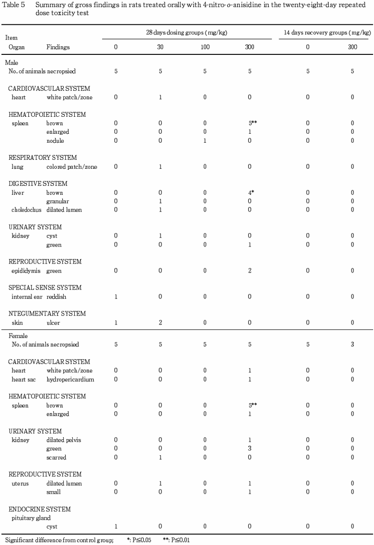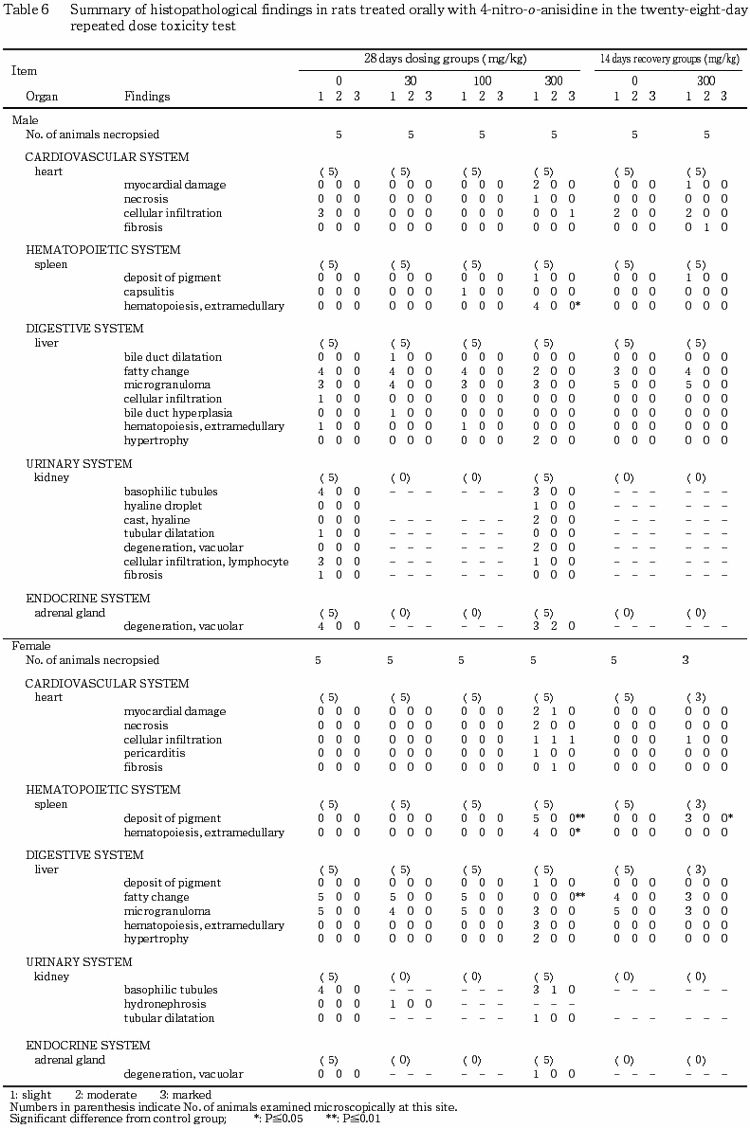 ÅêÍ¿½ªÎ»»þ¤Ë¤ª¤¤¤Æ¡¤Âоȷ²¤ËÈæ³Ó¤·¤ÆÈ︳ʪ¼ÁÅêÍ¿·²¤ÇÅý·×³ØÅª¤ËͰդË¿¤¯È¯À¸¤·¤¿½ê¸«¤È¤·¤Æ¡¤»óͺ¤Çç£Â¡¤Î¿ñ³°Â¤·ì¤¬Âоȷ²¤Ç0Îã¤Ç¤¢¤ë¤Î¤ËÂФ·¤Æ300 mg/kg·²¤Ç¤½¤ì¤¾¤ì4Îã¤Ë¡¤»ó¤Çç£Â¡¤Î¿§ÁÇÄÀÃ夬Âоȷ²¤Ç0Îã¤ËÂФ·¤Æ300 mg/kg·²¤ÇÁ´Îã¤Ë´Ñ»¡¤µ¤ì¤¿¡¥°ìÊý¡¤¸º¾¯¤·¤¿½ê¸«¤È¤·¤Æ´Î¡¤Î»éËò½¤¬»ó¤ÇÂоȷ²Á´Îã¤ÎȯÀ¸¤ËÂФ·300 mg/kg·²¤Ç¤Ï´Ñ»¡¤µ¤ì¤Ê¤«¤Ã¤¿¡¥¤Þ¤¿¡¤Âоȷ²¤ÇȯÀ¸¤¬¤Ê¤¯300 mg/kg·²¤ÇÊ£¿ôÎã¤ËȯÀ¸¤·¤¿½ê¸«¤È¤·¤Æ¡¤¿´Â¡¤Ë¿´¶Ú¤Î¾ã³²¡¤²õ»à¡¤´ÎºÙ˦¤ÎÈîÂ礬»óͺ¤Ë¡¤¿Õ¡¤Î¾Ë»Ò±ßÃ줪¤è¤Ó¶õˤÊÑÀ¤¬Íº¤Ë¡¤¿´Â¡¤ÎºÙ˦¿»½á¡¤´Î¡¤Î¿ñ³°Â¤·ì¤¬»ó¤Ë´Ñ»¡¤µ¤ì¡¤¤µ¤é¤Ë¿´¶Ú¤Î²õ»à¤ä¿´¶Ú¾ã³²¤ËÉտ魯¤ëÊѲ½¤È¤·¤ÆÀþ°Ý²½¤ª¤è¤Ó¿´³°Ëì±ê¤¬»ó¤Î1Îã¤Ëǧ¤á¤é¤ì¤¿¡¥¤Ê¤ª¡¤300 mg/kg·²¤Ç¾å½Ò¤Î¿´¶Ú¤ÎÉÂÊѤ¬´Ñ»¡¤µ¤ì¤¿¸ÄÂΤÏͺ2Î㤪¤è¤Ó»ó3Îã¤Ç¡¤¤½¤ÎʬÉۤϡ¤Íº¤Ç¤Ï¿´¶Ú¾ã³²¤ª¤è¤Ó²õ»à¤¬º¸±¦¤Î¿´¼¼¡¤ºÙ˦¿»½á¤¬º¸±¦¤Î¿´Ë¼¡¤º¸±¦¤Î¿´¼¼¡¤¿´ÀíÉô¡¤»ó¤Ç¤Ï¿´¶Ú¾ã³²¤¬º¸±¦¤Î¿´Ë¼¡¤º¸±¦¤Î¿´¼¼¡¤Ãæ³Ö¡¤²õ»à¤¬º¸±¦¤Î¿´¼¼¡¤ºÙ˦¿»½á¤¬º¸±¦¤Î¿´Ë¼¡¤º¸±¦¤Î¿´¼¼¡¤Ãæ³Ö¡¤¿´ÀíÉô¤ª¤è¤ÓÆýƬ¶Ú¡¤Àþ°Ý²½¤¬º¸±¦¤Î¿´¼¼¤Ç¤¢¤Ã¤¿¡¥¤Þ¤¿¡¤¤½¤ì¤¾¤ì¤ÎÉÂÊѤÎÄøÅ٤Ͽ´¶Ú¾ã³²¤ÏÃæÅùÅÙ¤¬»ó¤Ë1Î㡤Àþ°Ý²½¤ÏÃæÅùÅÙ¤¬»ó¤Ë1Î㡤ºÙ˦¿»½á¤ÏÃæÅùÅÙ¤¬»ó¤Ë1Î㡤¹âÅÙ¤¬»óͺ¤Ë³Æ1Îã¤Ç¤½¤Î¾¤Ï·ÚÅ٤Ǥ¢¤Ã¤¿¡¥
