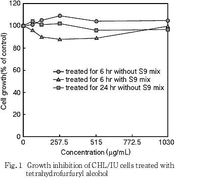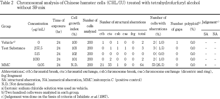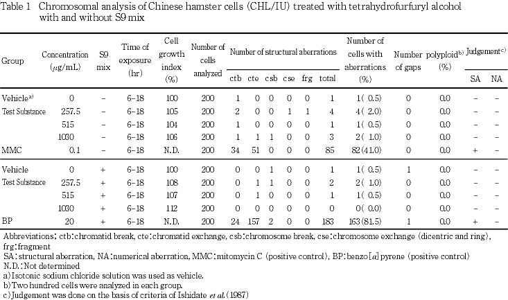 以上の結果から,テトラヒドロフルフリルアルコールは本試験条件下において,染色体異常を誘発しないと結論した.
