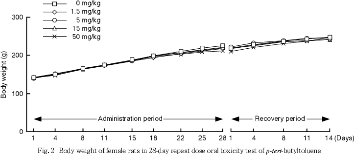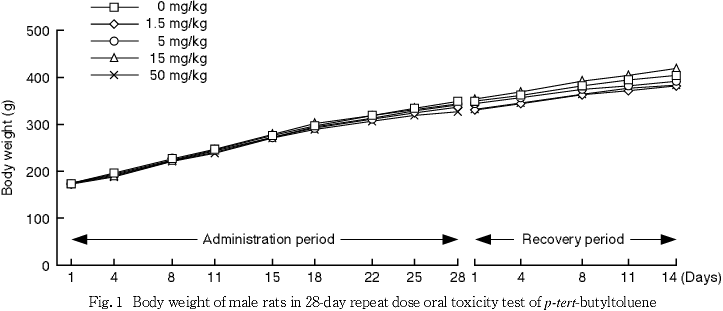 ρ-tert-ブチルトルエンは,コーンオイルで希釈溶解して調製した.なお,被験物質の調製に際して,純度による換算を実施した.0.2,2,20および200 mg/mLの調製液は,室温・遮光条件下で7日間保存しても安定性に問題のないことが確認されているため,各濃度の調製液は調製後,室温・遮光条件下で保管し,調製後7日以内に使用した.投与開始日および投与期間終了日に使用した各投与検体中の被験物質濃度を測定した結果,被験物質濃度に問題はなかった.