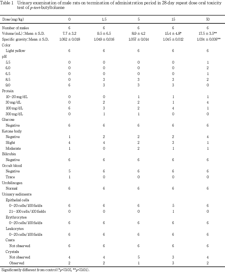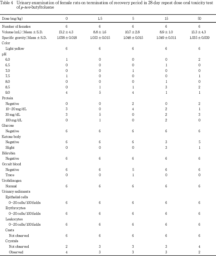 血液生化学検査において,5 mg/kg群の雄で尿素窒素および無機リンの高値,15 mg/kg群の雄で尿素窒素および無機リンの高値,雌でCaの低値,50 mg/kg群の雄でNaの低値,尿素窒素,クレアチニンおよび無機リンの高値,雌でKおよびCaの低値がみられた.また,50 mg/kg群の雌で腎臓の相対重量の高値がみられた.したがって,腎臓の病理組織学的変化はみられないものの,ρ-tert-ブチルトルエンは腎機能に影響を及ぼすと考えられる.回復期間終了時には,上記の血液生化学検査の変化および雌における腎臓の相対重量の変化は消失した.