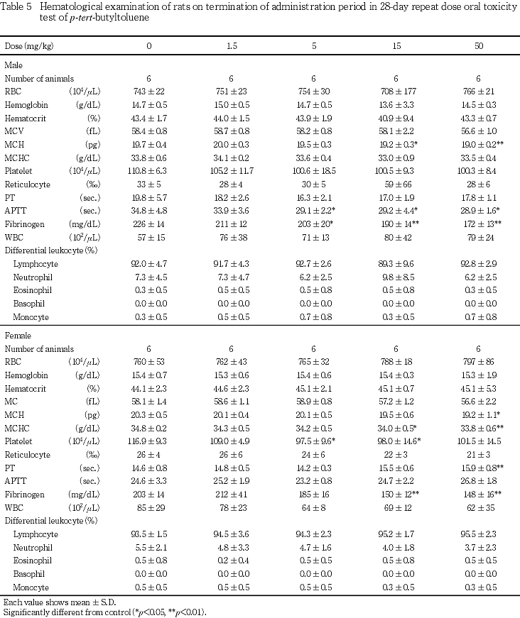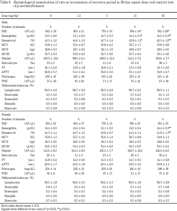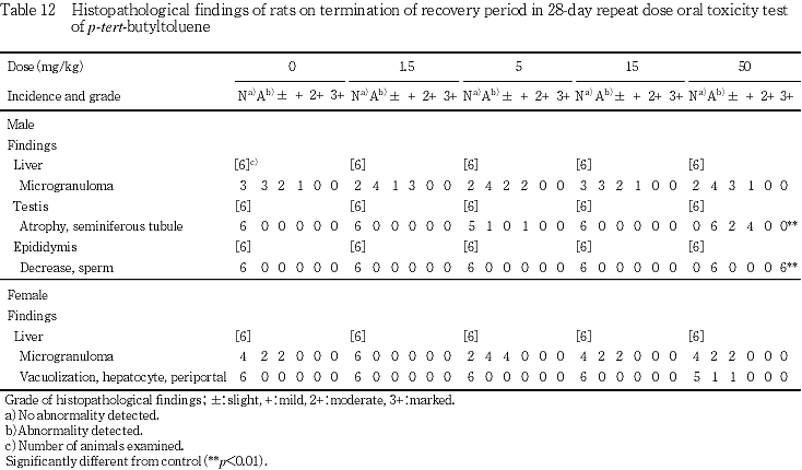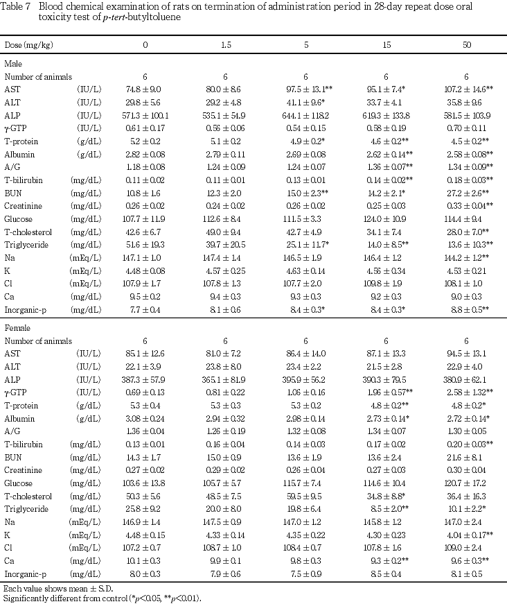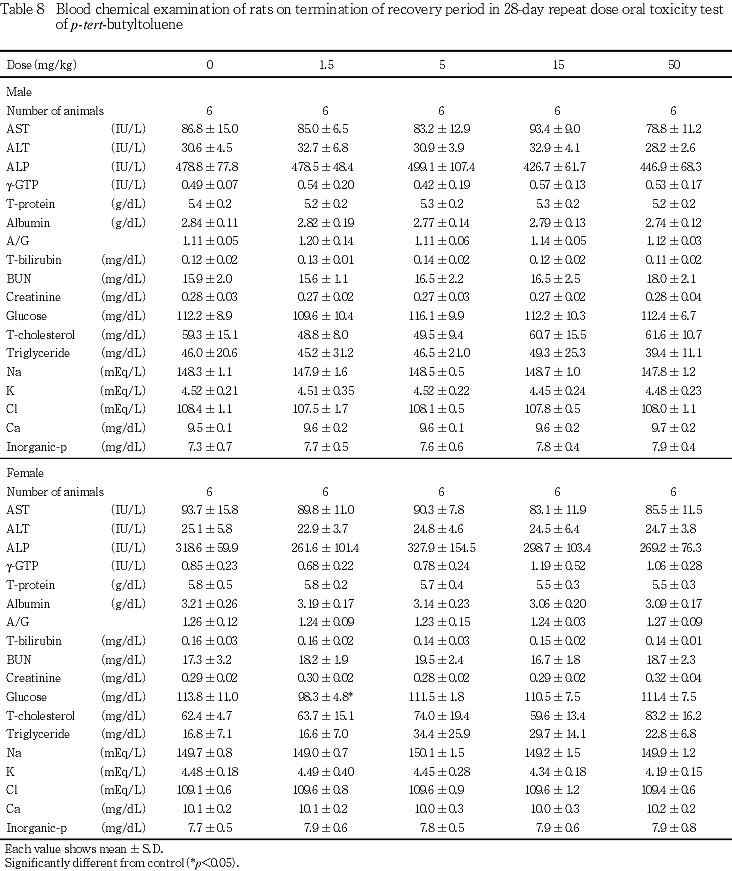 血液生化学検査において,5 mg/kg群の雄で総蛋白およびトリグリセライドの低値,ASTの高値がみられた.15 mg/kg群の雄で総蛋白,アルブミンおよびトリグリセライドの低値,AST,A/Gおよび総ビリルビンの高値,雌で総蛋白,アルブミン,総コレステロールおよびトリグリセライドの低値,γ-GTPの高値,50 mg/kg群の雄で総蛋白,アルブミン,総コレステロールおよびトリグリセライドの低値,AST,A/Gおよび総ビリルビンの高値,雌で総蛋白,アルブミンおよびトリグリセライドの低値,総コレステロールの低値傾向,γ-GTP,総ビリルビンの高値がみられた.器官重量では,15 mg/kg群の雄で肝臓の相対重量の高値が,雌で肝臓の絶対重量ならびに相対重量の高値が,50 mg/kg群の雄で肝臓の絶対重量ならびに相対重量の高値が,雌で肝臓の絶対重量ならびに相対重量の高値がみられた.また,病理組織学検査では,肝臓において50 mg/kg群で門脈周囲性肝細胞肥大が雌雄にみられており,ρ-tert-ブチルトルエンは肝臓に影響を及ぼすと考えられる.回復期間終了時には,上記の血液生化学検査の変化および肝臓の病理組織学変化は消失したものの,15 mg/kg群の雌で肝臓の相対重量の高値,50 mg/kg群の雌で肝臓の絶対重量ならびに相対重量の高値がみられた.なお,肝臓における肝細胞肥大は,他の類似物質(3-フェノキシトルエン2))においても報告されている.