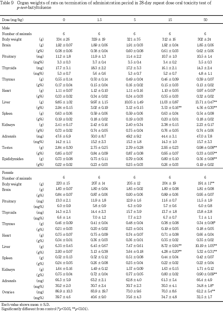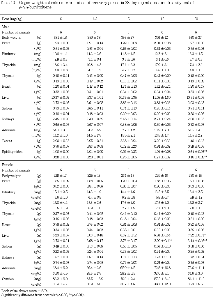 その他の器官には,投与期間終了時に器官重量において50 mg/kg群の雌で卵巣の絶対重量の低値,副腎の相対重量の高値がみられた.これらの器官には,病理組織学的変化はみられないものの,ρ-tert-ブチルトルエンの影響は否定できない.