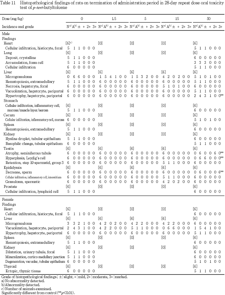 剖検において,投与期間終了時に50 mg/kg群の雄で両側精巣と両側精巣上体の萎縮が6例みられた.また,器官重量において,50 mg/kg群の雄で精巣および精巣上体の絶対重量ならびに精巣の相対重量の低値がみられた.病理組織学検査においても,50 mg/kg群の雄で精巣に精細管萎縮およびライディヒ細胞の過形成が6例,精巣上体に精巣上体管腔内の精子減少が6例みられた.以上のことから,ρ-tert-ブチルトルエンは精巣および精巣上体に影響を及ぼすと考えられる.回復期間終了時にも,50 mg/kg群の雄で両側精巣の萎縮が6例,両側精巣上体の萎縮が4例みられた.50 mg/kg群の雄で精巣上体の絶対重量ならびに相対重量の低値,精巣の絶対重量ならびに相対重量の低値傾向がみられた.病理組織学検査においても,50 mg/kg群の雄で精巣に精細管萎縮が6例,精巣上体に精巣上体管腔内の精子減少が6例みられた.したがって,ρ-tert-ブチルトルエンによる精巣および精巣上体への影響は,14日間の回復期間では回復しないと考えられる.