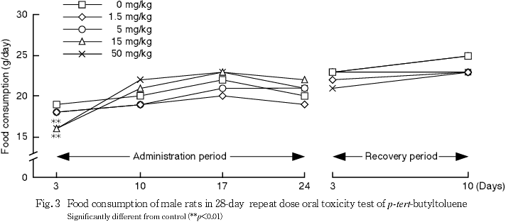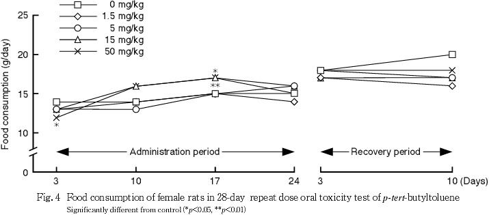 摂餌量では,15 mg/kg群の雄と50 mg/kg群の雌雄で投与期間の初期に摂餌量の低値がみられた.しかし,回復期間中には,この変化は消失した.