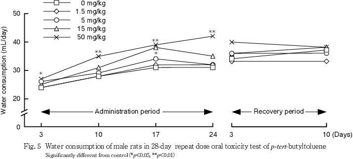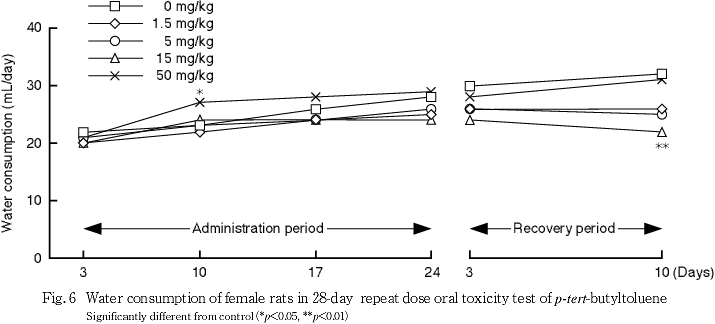 雌において,1.5,5および50 mg/kg群では対照群と比べていずれの測定日の摂水量にも有意差はみられなかった.なお,15 mg/kg群では,対照群と比べて回復10日に摂水量の有意な低値がみられたが,投与量に依存した変化ではないことから,毒性学的影響とは考えられない.