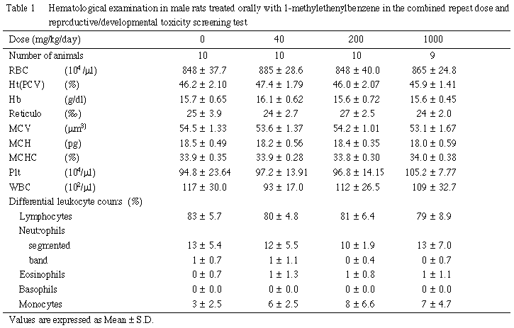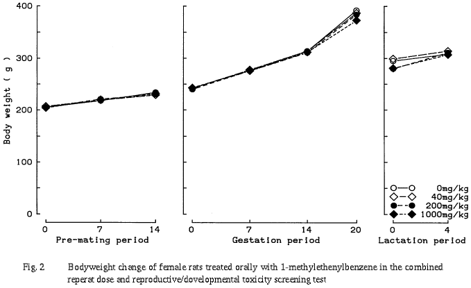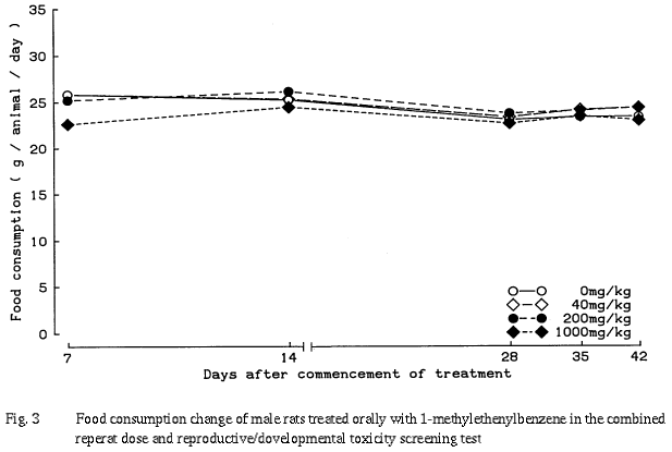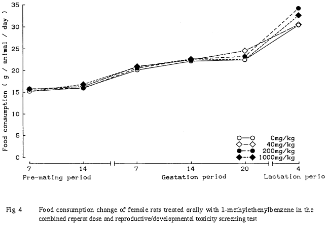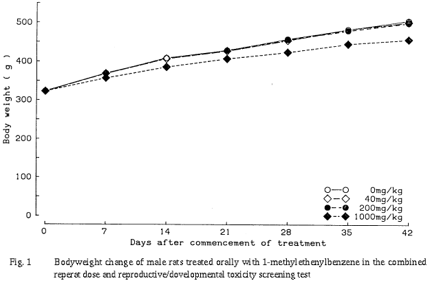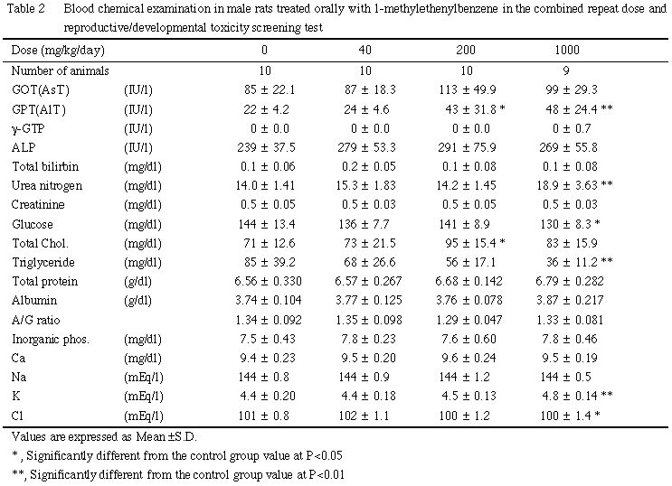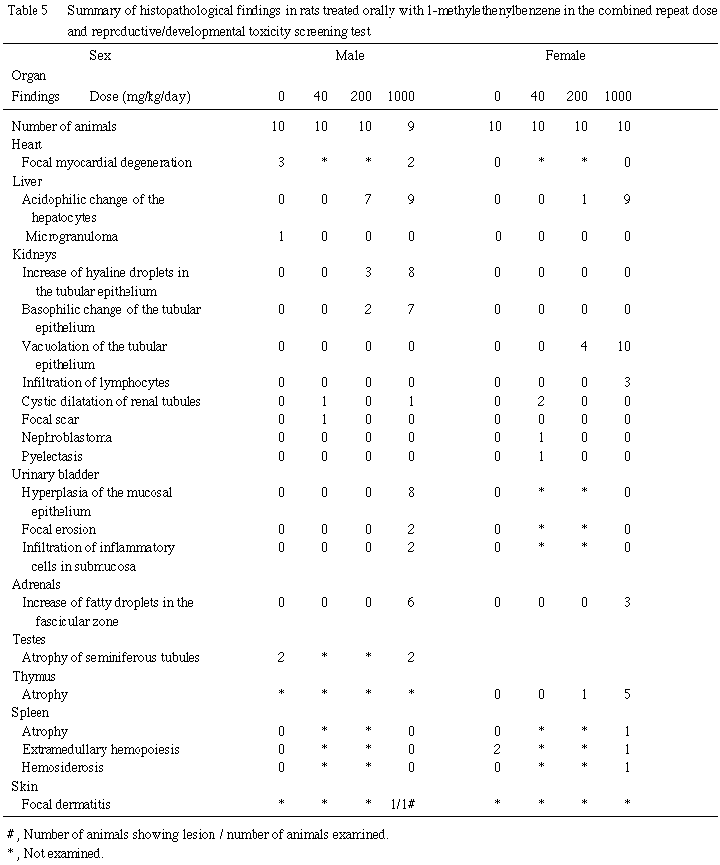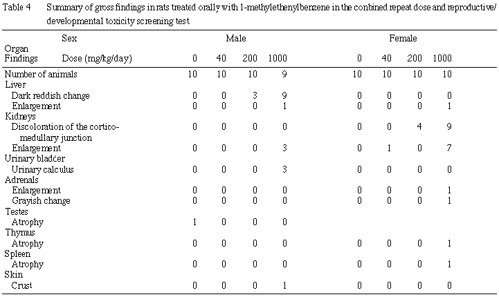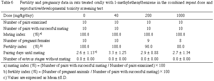 以上の結果より,1-メチルエテニルベンゼンの反復投与毒性に関する無影響量は雌雄とも40 mg/kg/day, 生殖発生毒性に関する無影響量は,親動物に対して雄が1000 mg/kg/day,雌が200 mg/kg/day,児動物に対しては200 mg/kg/dayと考えられる.