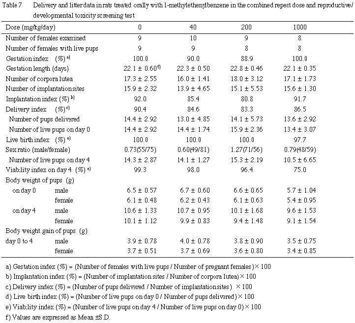 1000 mg/kg群では2腹の全新生児が死亡したため,有意差は認められなかったものの,4日生存率が若干低値を示した.しかし,他の腹では生後の死亡は認められなかった.出産児数,出産生児数,性比および出生率には,対照群と被験物質投与群との間に有意な差は認められなかった.
