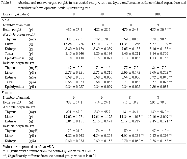 なお,1000 mg/kg群の精巣の対体重比が高値を示したが,実重量では対照群と有意な差がなく,また組織検査および生殖機能検査においても被験物質に起因する変化が認められなかったことから,体重増加抑制が反映した見掛け上の変化と判断した.