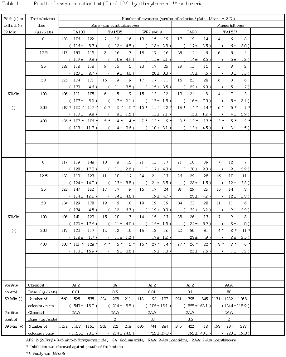 以上の結果に基づき,1-メチルエテニルベンゼンは,用いた試験系において変異原性を有しないもの(陰性)と判定した.