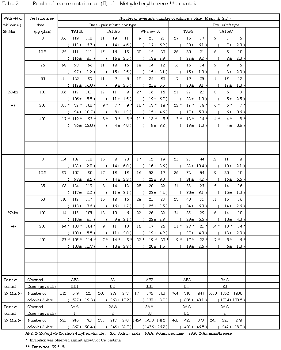その結果,2回の本試験とも,用いた5種類の検定菌について,いずれの用量でも溶媒対照群の2倍以上となる変異コロニー数の増加が認められなかったことから,1-メチルエテニルベンゼンは,用いた試験系において変異原性を有しない(陰性)と判定された.