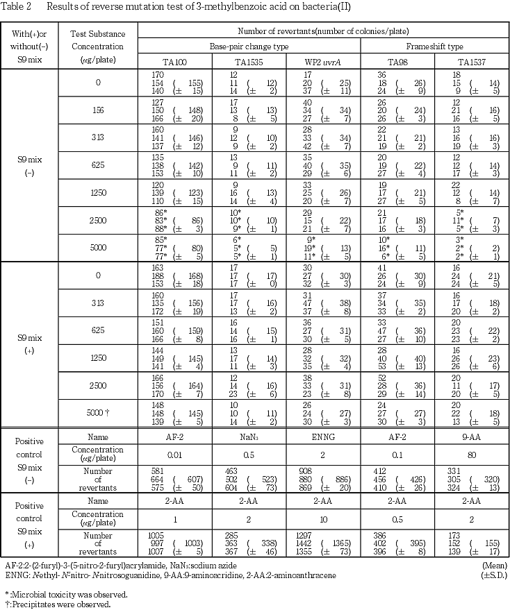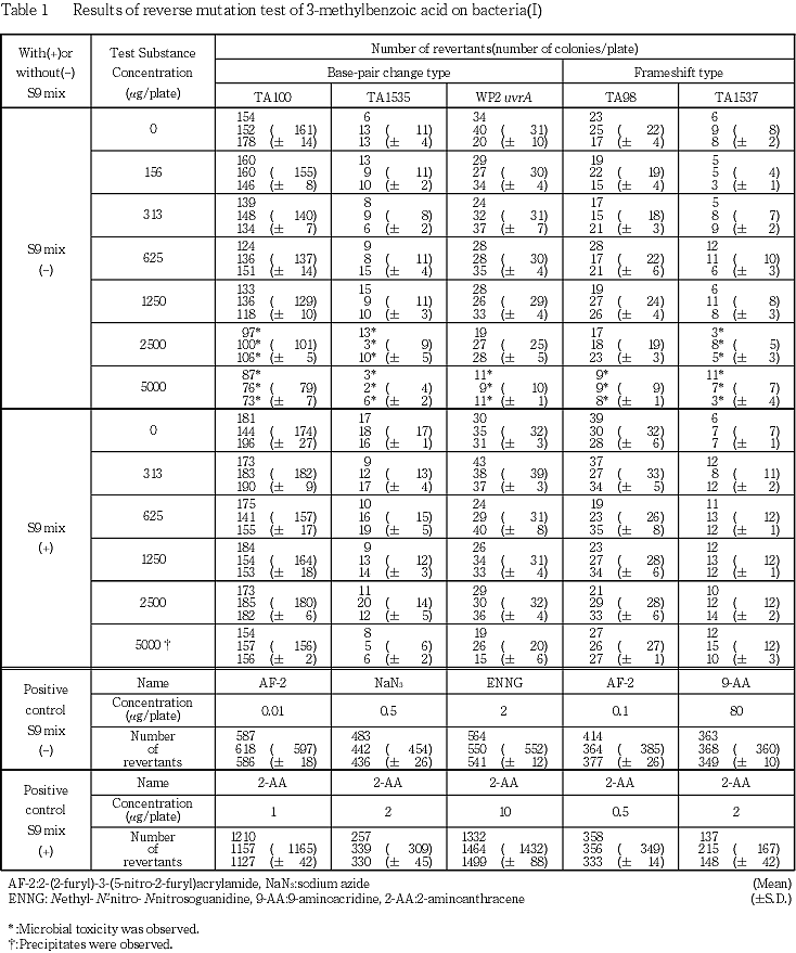 以上の結果から,3-メチル安息香酸は本試験系において変異原性を有さない(陰性)と結論した.
